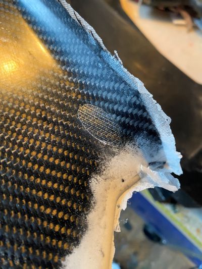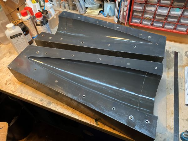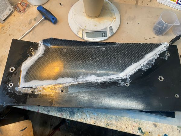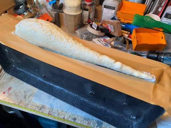 Ich war doch positiv überrascht. Auch hier war es dann nicht notwendig einen oder mehrere Versuchsabzüge zu machen, die Finnen sind mit dem ausgewählten Laminataufbau ziemlich genau so geworden wie angedacht. Die Raupe aus Glasballonmatsche hat dafür gesorgt, das die Kanten ziemlich gut und fehlerfrei aus der Form kommen, auch bildet sie innen einen etwa 10mm breiten umlaufenden Klebesaum, der beide Hälften einwandfrei miteinander verbindet. Aus optischen Gründen hätte man die Pampe auch mit schwarzer Farbpaste einfärben können, aber aus Gründen der Sichtbarkeit und um den Verlauf nachzuvollziehen hab ichs mir geschenkt. Kein Sichtcarbon, der Apparat wird eh weiß lackiert. Wandstärke ist echt dünn und eine gesäuberte Fine wiegt exakt 100g. Die Carbonmatte war hier goldrichtig. Die fertige Finne ist in Längsrichtung auch durch den Klebesaum extrem steif, durch die Verklebung und Fillets an der Wurzel, dort wo sie auf dem Körperrohr sitzen wird, wird das noch verstärkt werden, allerdings ist die Finne ein Hohlkörper und lässt sich dann auf der Fläche immer noch ziemlich eindrücken. Ziemlich leicht sogar. Optimal wäre es diesen Hohlkörper zu füllen oder durch einen eingeklebten Spant diese Flexibilität zu beseitigen. 2K-PUR Schaum zum Gießen ist ja nun für Privatpersonen nicht mehr ganz so einfach zu bekommen, eine Bestellung über die Einkaufsabteilung unserer Firma wäre möglich, aber, ich hab da noch eine nicht angebrochene, original verpackte, allerdings völlig überlagerte Arbeitspackung im Regal stehen. Nach zehn Jahren über Verfallsdatum sind Harz und Härter klumpig auskristallisiert, aber auf dem Beipackzettel stand, das lässt sich durch erhitzen im Wasserbad auf 70° wieder verflüssigen. Der erste Versuch zum Ermitteln der benötigten Menge lieferte auf jeden Fall ein gewohntes und gewünschtes brauchbares Ergebnis, auch wenn das Zeug jetzt eher so 3-4Minuten anstatt 2 Minuten zum ausreagieren und hart werden braucht. So stand dem weiteren Vorgehen nichts mehr im Wege, die Finnen werden ausgeschäumt. Dazu hab ich die Finne nach Begutachtung wieder in die Form gesperrt um ein Verformen durch den quellenden Schaum zu verhindern. Eine fertig ausgeschäumte, gesäuberte, bocksteife Finne wiegt dann zwischen 125 und 130 Gramm pro Stück. Da lässt sich doch mit Arbeiten. Auf jeden Fall. Um nochmal auf die störrische, weil schiebefest vorbehandelte Carbonmatte zurückzukommen: Leider ließen sich trotz der Sandsäcke zum Andrücken, zwei, drei Fehlstellen immer an derselben Stelle und immer in derselben Größe nicht vermeiden. Als strukturell unkritisch befunden wird das später mit Glasmatsche verspachtelt, das wird hier kein Sichtcarbon. Und wenn das Rohr später auch zig Macken aufweist, kann ich das ganze hinterher immer noch als Probeabzug unter dem Deckmantel von Forschung und Lehre deklarieren und nochmal und besser machen. Soweit Jan Geändert von Kabelmann am 07. Dezember 2025 um 13:21 |