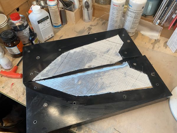 Die Formen werden genauso vorbehandelt wie schon bei der Spitze, nur der Laminataufbau wird anders. Nach den Erkenntnissen zu Laminatstärke und zu erwartender Festigkeit wird das hier probeweise in die Form gelegte 320g/qm Glasgelege NICHT verwendet. Zu schwer. Wo bei der Spitze das Gewicht absolut unkritisch ist, ist hier knausern angesagt. Wie Roman schon schrieb, jedes unnötige Gramm hier wird nochmal doppelt in der Spitze gebraucht. Hier ist die bidiagonale 45°/45° Faserrichtung schön zu sehen. Würde auch strukturell gerade hier an der Finne gute Dienste leisten, aber: Zu schwer. Aufbau wird (von aussen nach innen), 1x 166g/qm Glas, 1x 200g/qm Carbon, 1x166g/qm Glas. Die Kohlematte ist ein Reststück, Köper, schiebefest vorbehandelt. Hat den Vorteil das das nicht ausfranst (auch wenn man das von Hand schneidet), ideal für Sichtcarbon, aber extrem störrisch beim in die Form drapieren. Allerdings ist der bindende Kleber wärmeempfindlich, und so lässt sich so ein störrisches Stück mithilfe eines Föns vorher passend hinformen. Anprobe der lasergeschnittenen Gewebestücke passt gut, wenn ich das bei einem eventuellen zweiten mal besser machen will, kann hier und da noch ein, zwei Millimeter mehr dran. Aber Hauptsache da steht nix über den Formenrand hinaus. Um eine schöne Kante ohne Fehlstellen zu bekommen und um sicherzustellen, das sich die beiden Finnenhälften später schön miteinander verbinden hab ich als erstes eine fette Raupe aus mit Glasballons angedicktem Harz vorgelegt. Um die Finne hier später besser kleben zu können, hab ich hier zwei Stücke Abreissgewebe mit einlaminiert. Nach dem Fügen der beiden Formenhälften offenbart sich das Dilemma mit der störrischen Carbonmatte. Das mit dem Fön wusste ich da noch nicht, und so wollte das Zeug partout nicht um die Kurve für die breite Wurzel der Finne. Damit das in die Form gedrückt wird mussten zwei Plastikbeutel Strandsand herhalten, und damit die nicht festkleben und es beim Entfernen kein Unglück geschieht, gabs noch Backpapier und Frischhaltefolie zu Trennzwecken. Die fertige Finne hat dann immer in der Küche auf der Fußbodenheizung übernachtet. Geändert von Kabelmann am 06. Dezember 2025 um 18:31 |