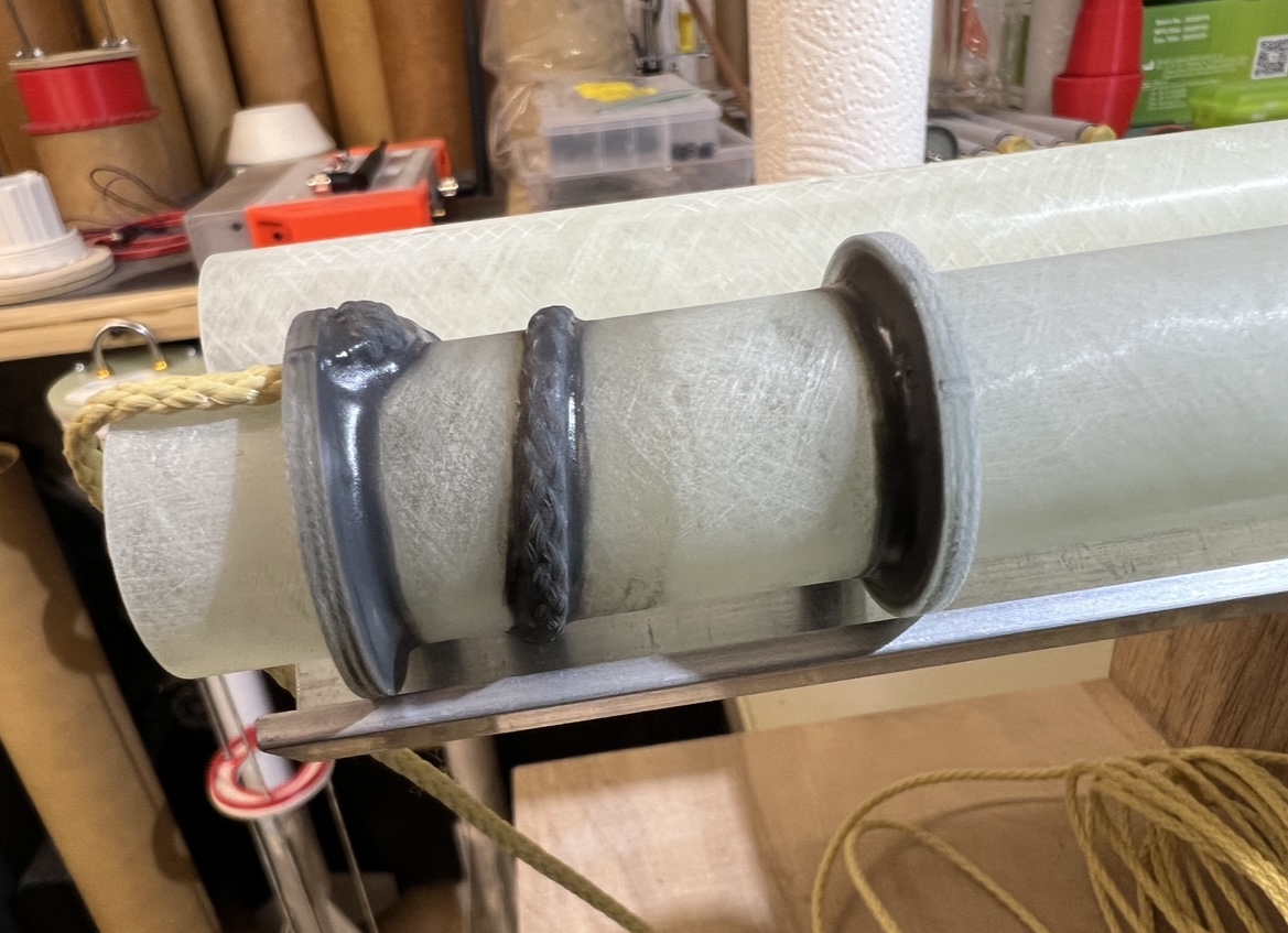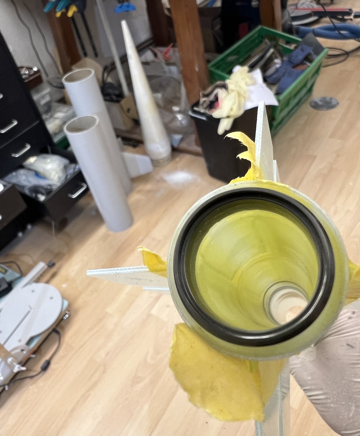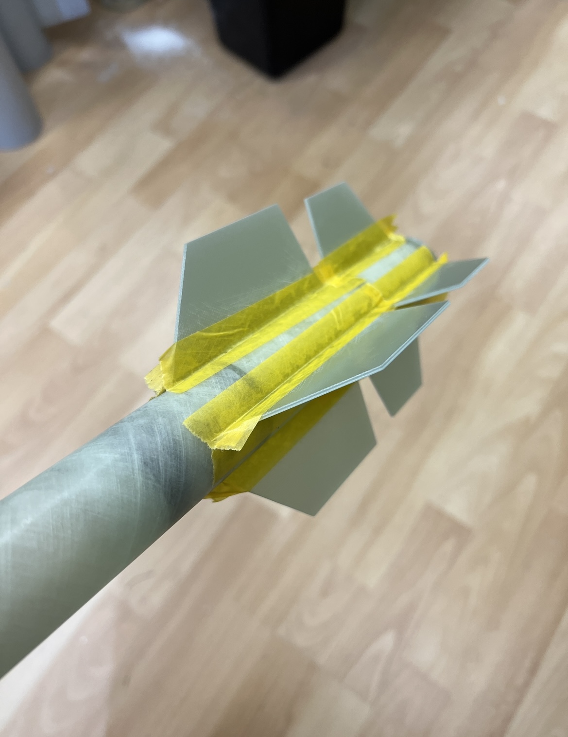 Und wieder ein wenig weiter … Das zweite set Finnen … Alle Finnen sind angeheftet … Ich hatte die Körperrohr Schlitze jeweils an einer Stelle mit dem Proxxon etwas geöffnet . Hier habe ich jetzt mit einer Spritze in jede “Kammer” ein definiertes Volumen Harz gegeben. 1ml in die großen vorne und 0,5ml in die kleinen hinten … alles mit Klebeband abgedichtet und dann sehr lange in alle Richtungen gedreht … das Harz hat sich so entlang aller innen Stosskanten gesetzt und quasi mini fillets ausgebildet .. im unteren Bild kann man gut sehen wie alles benetzt ist .. Bei der kleinen habe ich schonmal mit den außen Fillets angefangen … Heute also später geht es dann weiter . Grüße Marco