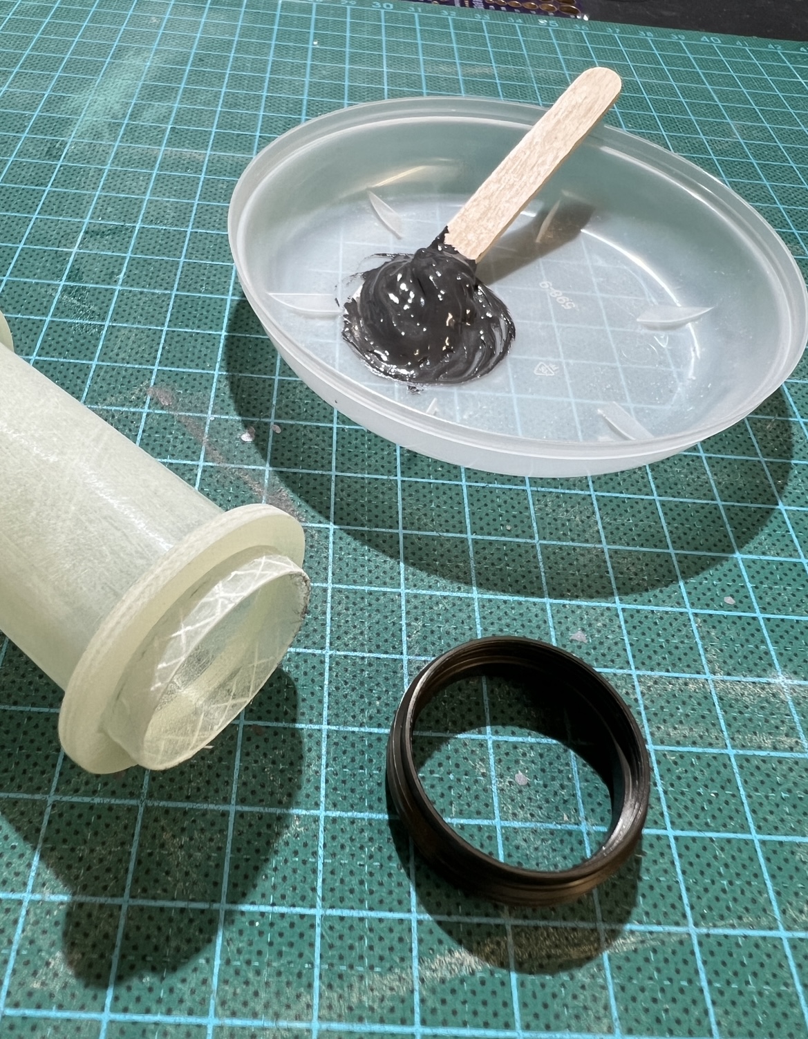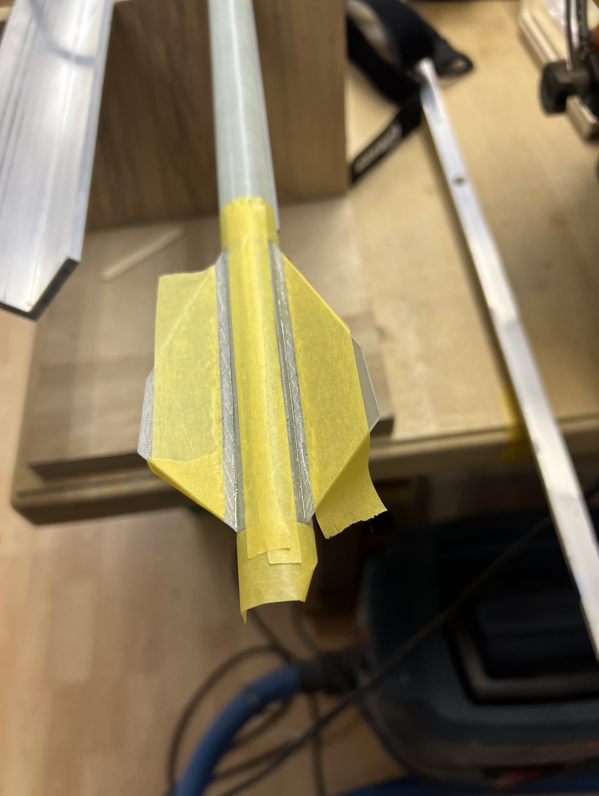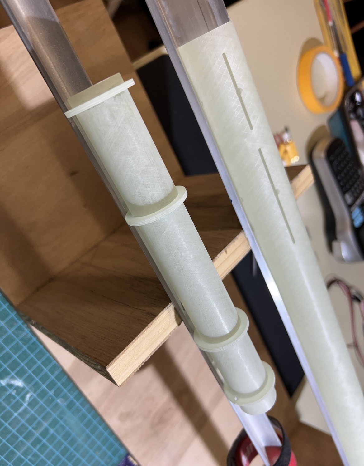 Und wieder ein wenig weiter … Das zweite set Finnen … Alle Finnen sind angeheftet … Ich hatte die Körperrohr Schlitze jeweils an einer Stelle mit dem Proxxon etwas geöffnet . Hier habe ich jetzt mit einer Spritze in jede “Kammer” ein definiertes Volumen Harz gegeben. 1ml in die großen vorne und 0,5ml in die kleinen hinten … alles mit Klebeband abgedichtet und dann sehr lange in alle Richtungen gedreht … das Harz hat sich so entlang aller innen Stosskanten gesetzt und quasi mini fillets ausgebildet .. im unteren Bild kann man gut sehen wie alles benetzt ist .. Bei der kleinen habe ich schonmal mit den außen Fillets angefangen … Heute also später geht es dann weiter . Grüße Marco