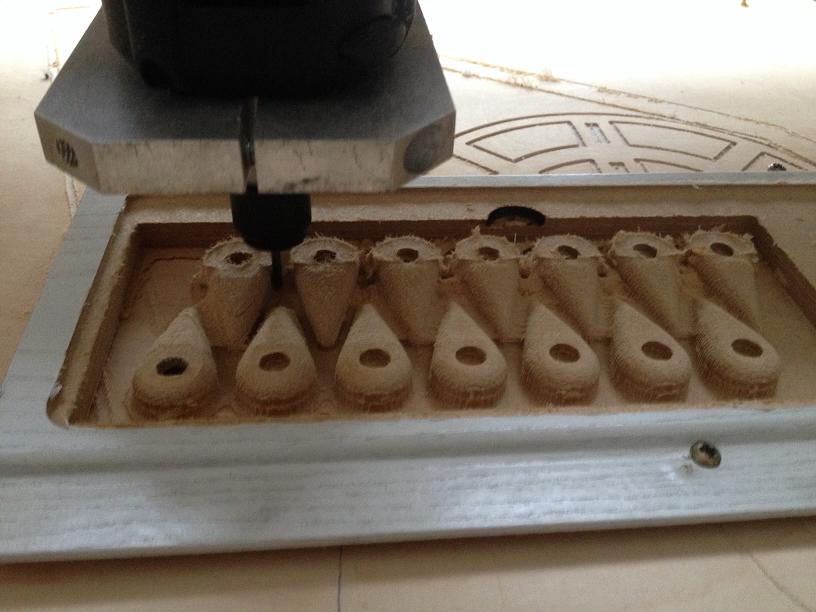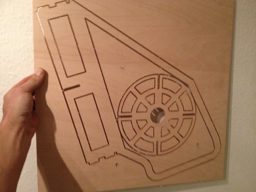 Gestern wurden die Kanten der Rohre noch mit Cyanacrylat getränkt und geschliffen, so sind diese auch hart und fransen nicht mehr aus. Heute war dann wieder Maschinentag. Die restlichen drei Spanten und Finnen wurden gefräst. Die Stege, die ausgefräste Inseln an Ort und Stelle halten, wurden etwas größer gemacht als zuvor. Beim ersten Spant sind einige Teile herausgeflogen. Wer mit dem Fräsen anfängt sollte erstmal große Stege machen. Wenn sich ein Teil löst und der Fräser kollidiert, hat man sehr schnell Schrittverluste und das Bauteil ist hin oder der Fräser bricht ab! So schaut dann eine fertige Platte aus:  Habe inzwischen gute Parameter für das Holz gefunden. Ich habe nur die Stege mit einem Cuttex abgeschnitten, sonst nichts entgratet: So schaut die komplette Motor-/Finnenhalterung aus. In der Mitte der Hybrid, um zu sehen ob wirklich alles passt: Auf den geschlitzten Ring unten kommt ein kleiner Heizlüfter, der den Hybridtank auf Temperatur hält. So ist der volle Druck beim Start da. Noch ein Blick auf die Steckverbindungen: Bei 4 Finnen, die unten überstehen habe ich es von Hand nie geschafft, dass alle flächig und winklig aufliegen. Mit der CNC-Fräse kein Problem, das kippelt nichts. Gruß Fabian