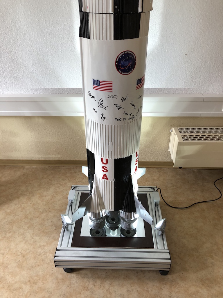 Andreas hat da ganze Arbeit geleistet und die Saturn V mit Spiegel und Halogenstrahler in das richtige Licht gesetzt. So kann man auch von unten die Düsen und das Heck ohne sich bücken zu müssen, betrachten