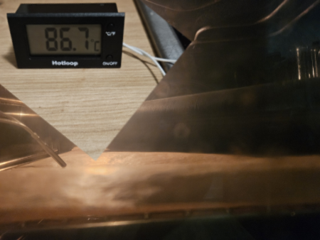 ich habe den Backofen auf etwa 85 Grad vorgeheizt und gewartet, bis sich die Temperatur eingependelt hat. Die Schwankungen lagen bei mir so zwischen 82,5 und 88 Grad.