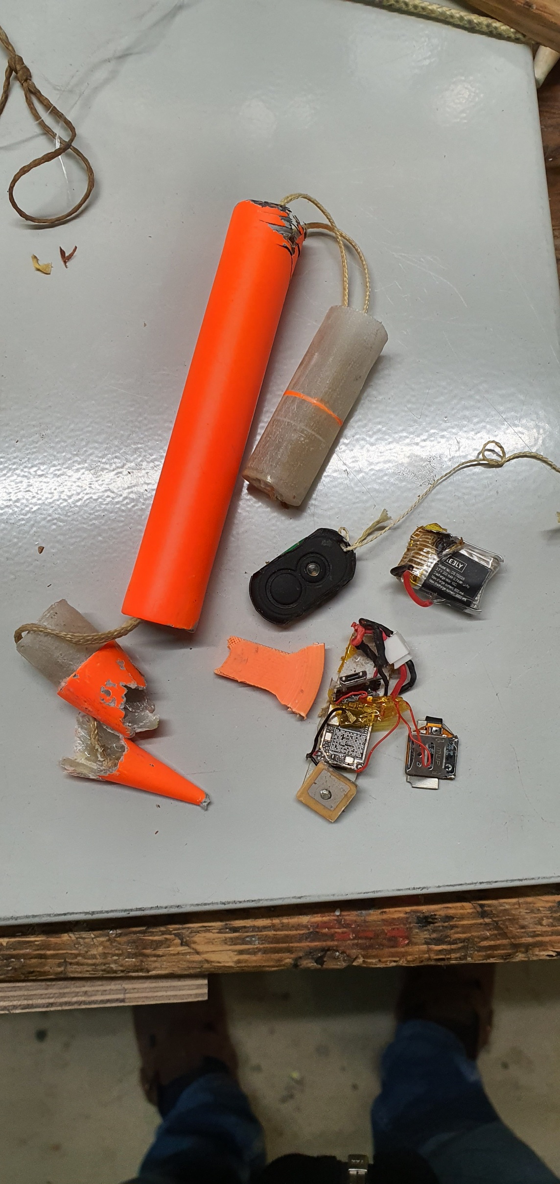 Dann ist das Rohr aber auch wirklich voll. Die Ladung war wohl etwas zu sportlich bemessen. Durch den Kolben hat der Schirm aber keine Brandflecken bekommen. Die Kevlarstrippen des Fallschirms schützen ja auch noch ein bisschen.