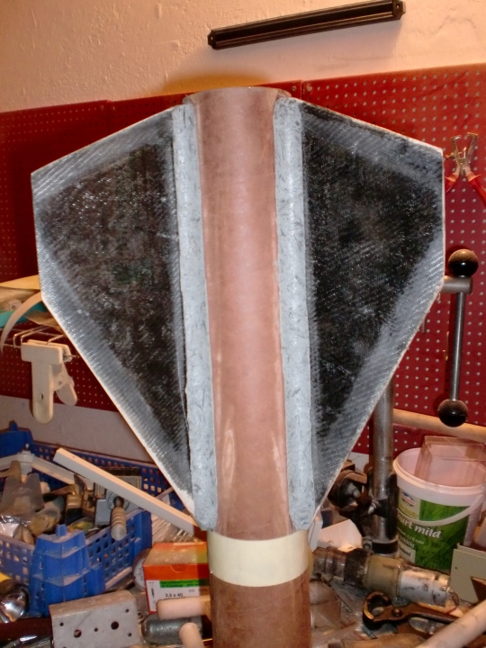 Die Flossen wurden mit dicken Epoxy-Kohlefaserschnitzel-Fillets aufs Motorrohr geharzt, dabei wurde der Radius durch ein 25mm PVC-Rohr geformt: