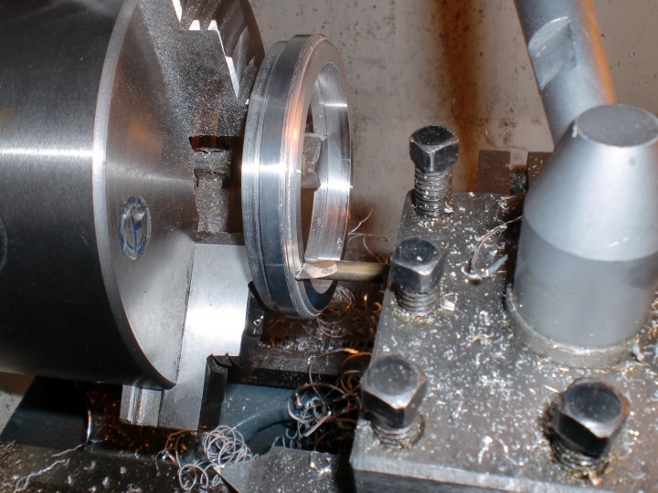 Weiter gings mit dem ersten Zentrierring, welcher gleichzeitig die Aufgabe der Motorhalterung übernimmt. Dazu bekommt er später noch 3 M3 Gewinde. Also Drehbank angeschmissen...