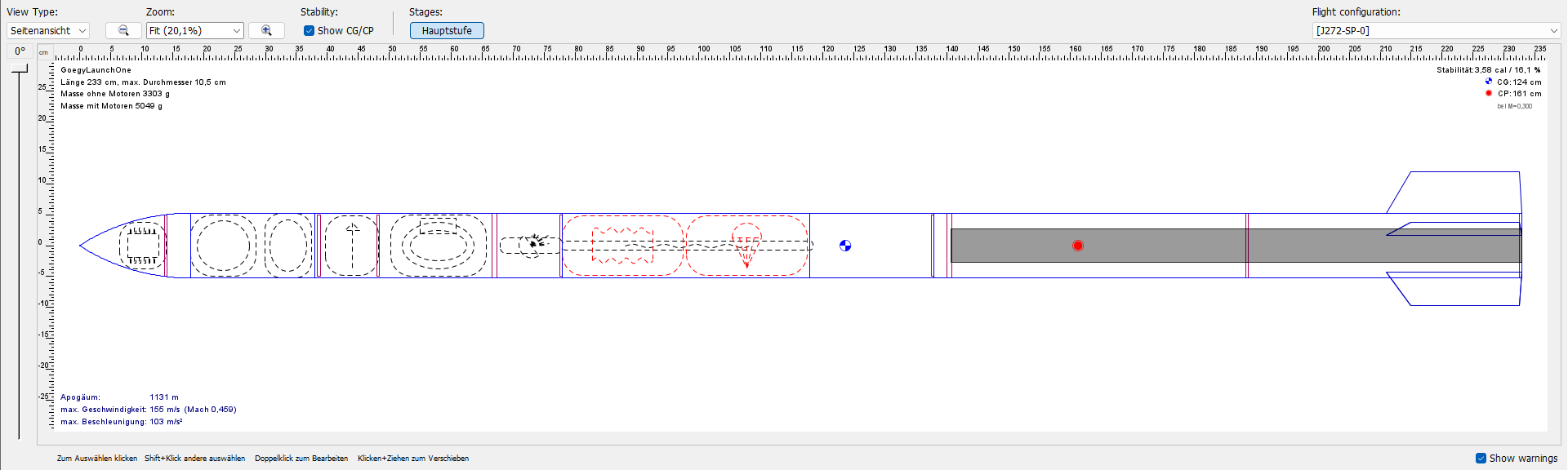 Hallo Andreas, Das hier ist der Plan in OpenRocket soweit bisher geplant. Eine Anmerkung: Dieser Teil ist bisher noch nicht fertig geplant. In den nächsten beiden Wochen werden wir diesen Teil noch ändern, da wir hier noch die Tipps und Anregungen aus dem Forum mit einbeziehen wollen. Viele Grüße Tim und Fabian